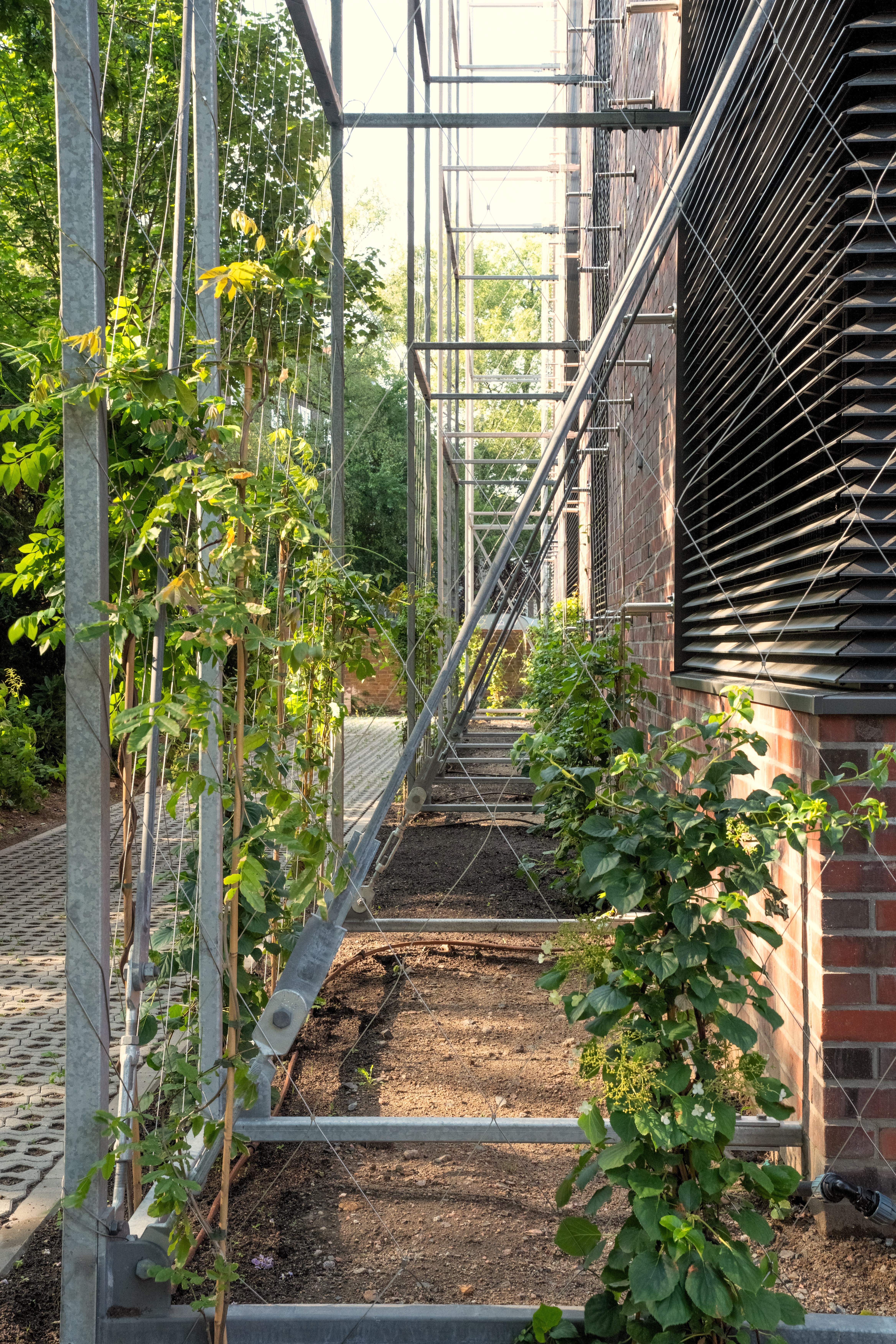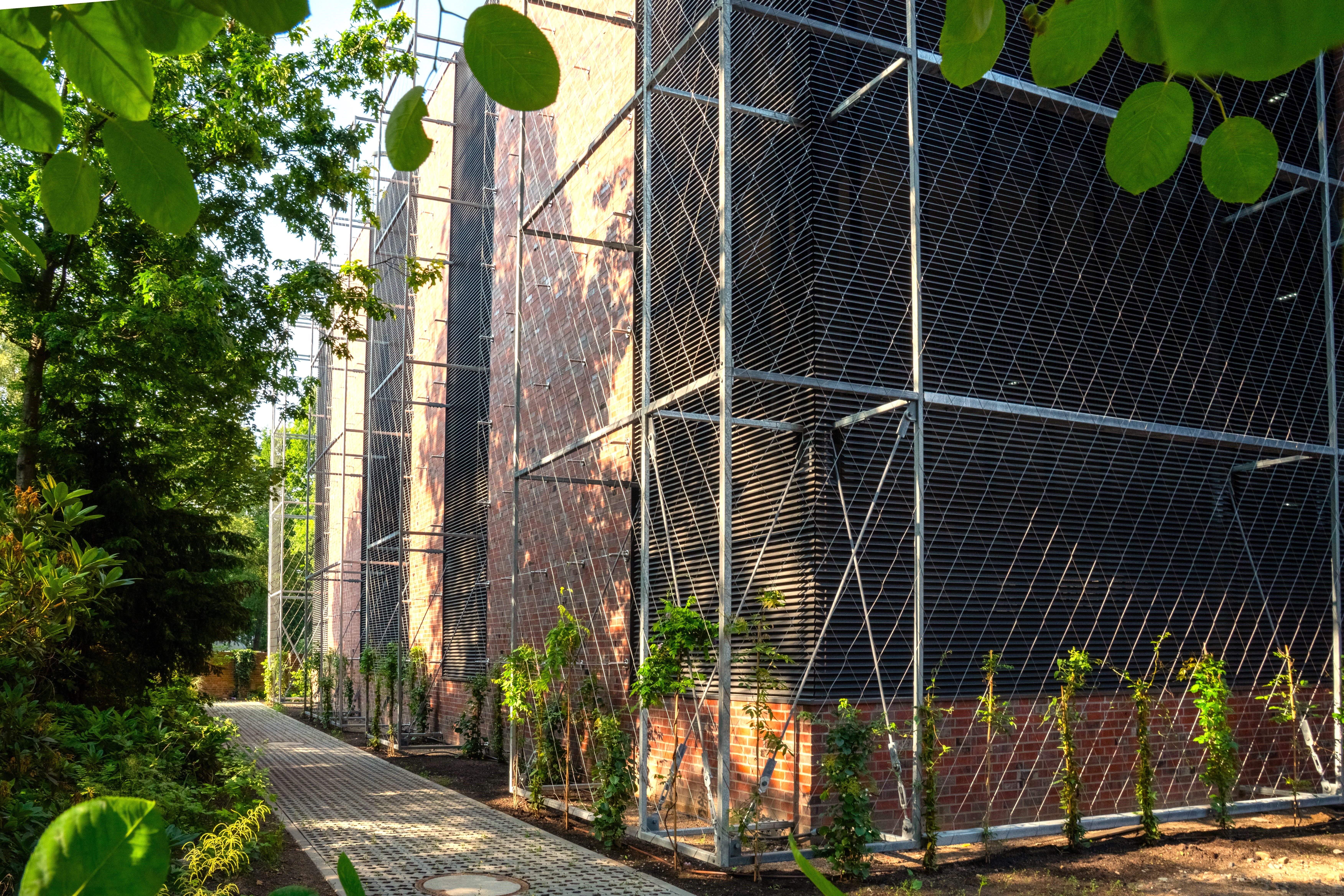 - Aufwendige Fassade als Kombination aus Lamellen, Riemchen und Grünfassade