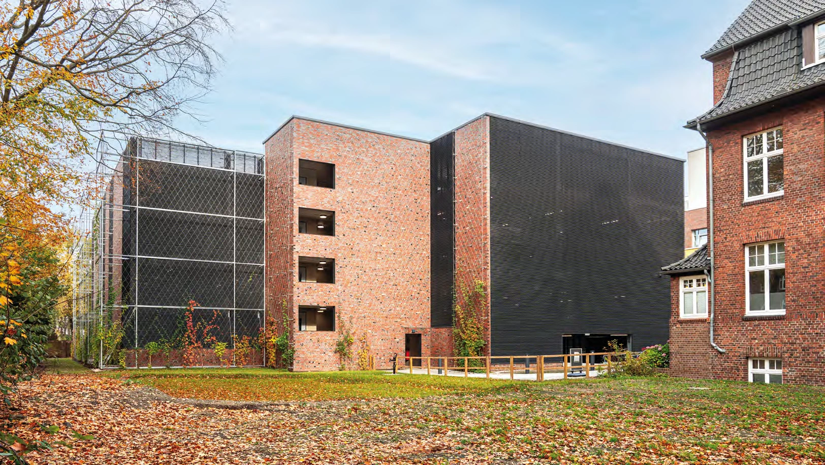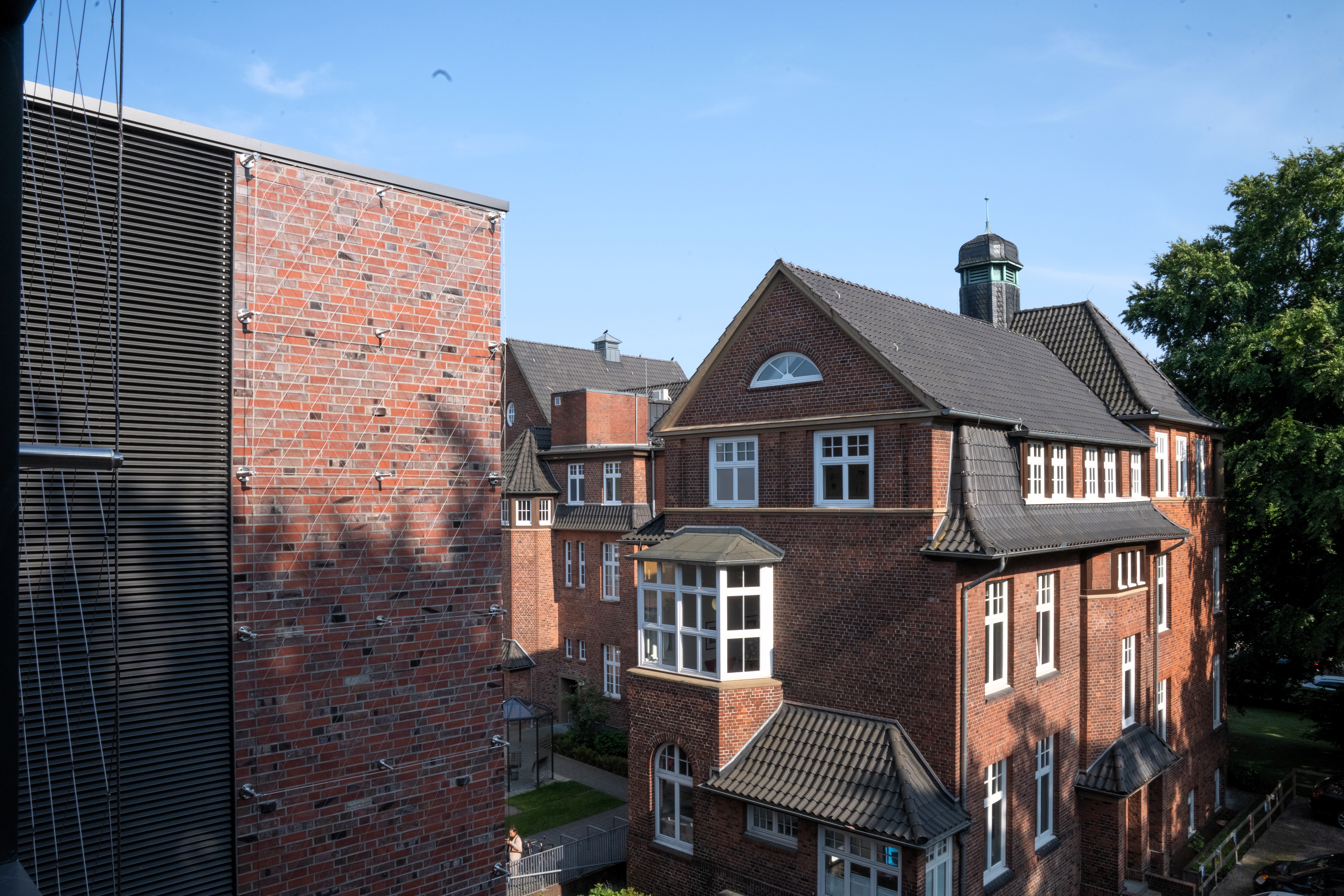 - Fassadenverkleidung in Anlehnung an die Optik der bestehenden Gebäude des Kinderkrankenhauses